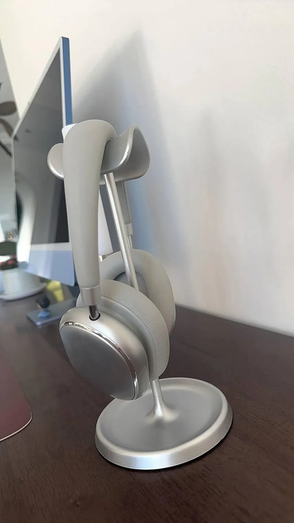 A minimalist headphone stand designed to keep your workspace organized while protecting your headphones. The curved headrest supports the natural shape of the headband, while the stable weighted base ensures secure placement on any desk.